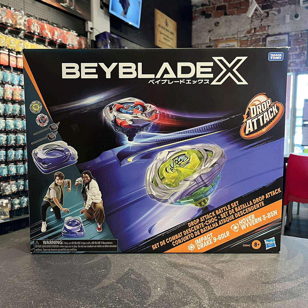 The Beyblade X Drop Attack Battle Set has all you need to begin battling – Beystadium, 2 tops, and 2 launchers! The stadium’s X-Celerator Rail can super-accelerate tops into an Xtreme Dash around the arena for crushing collisions and epic bursts. And with Drop Attack Beystadium, you can get a drop on your opponent’s top -- the stadium’s elevated X-Celerator Rail can send Beyblade tops to a higher elevation, where they can drop down on their opponent’s tops below! Use the 2 launchers to unleash the Impact Drake 9-60LR Attack Type top and the Hover Wyvern 3-85N Defense Type top in a frenzy of fury. Bladers launch their top against their opponent’s scoring points – first to 4 points wins. Mix and match the interchangeable blade, ratchet, and bit with the layers of other Beyblade X tops (sold separately) to build your perfect top. Hasbro Beyblade toys with authentic Takara Tomy die-cast metal tops make great kids gifts for boys and girls ages 8 and up.